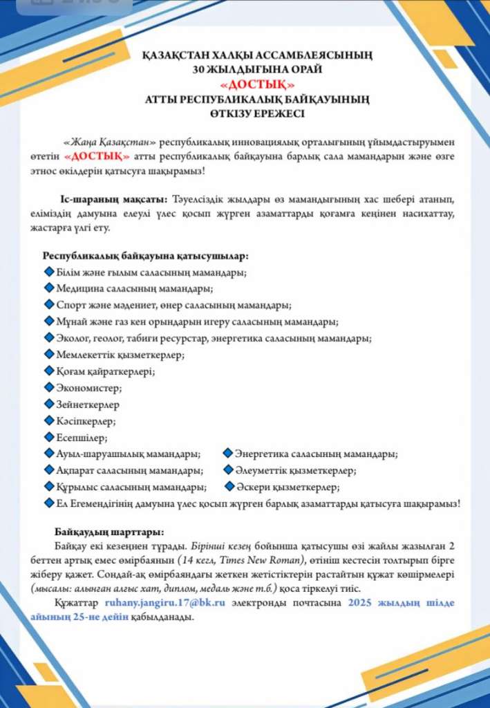 Басты бет Бір шаңырақ астында Қазақстан Халқы Ассамблеясының 30 жылдығына орай «Достық» республикалық байқауыына қатысуға шақырамыз