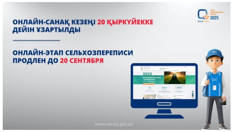 Ауыл шаруашылығы кәсіпорындары үшін онлайн-санақ кезеңі 20 қыркүйекке дейін ұзартылды. Барлық заңды тұлғалар, шаруа және фермер қожалықтары, сондай-ақ ауыл шаруашылығымен айналысатын жеке кәсіпкерлер санақтан sanaq.gov.kz сайтында өте алады.