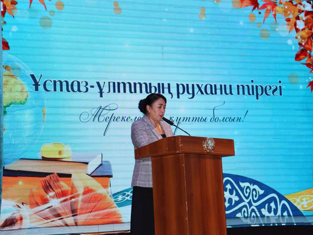 Жылы лебізін білдіру үшін сахна төріне аудан әкімі Бота Елеусізова шықты. Адам баласының жүрегінде қадір тұтып, құрметтейтін екі ұғым болса, соның бірі – Ұстаз, – деп ыстық ықыласын бастаған аудан басшысы жиналған қауымға ақжарма тілегін төкпеледі. «Ұстаз» деген қашанда қасиетті, қадірлі болған. «Ұстаздан тәрбие алған» немесе «ұстаз алдын көрген» деген сөздер құлаққа «ана тәрбиесін алған» деген сөздермен ұштасып жатады. Алғаш әріп танытып, өмірдің қыр сырын білуге, сан қилы құбылыстарын терең түсінуге мұрындық болып, жан дүниеңе нұрлы шуақ түсіріп, адамгершілікке баулыған мұғалімнің бейнесі бәріміздің көңіл төрінен орын алатындығын айтып, әр шәкіртін аялап, өмір атты шексіз ғаламға топшысын қатайтып ұшыратын, аса жауапты жүкті арқалап жүрген сіздерге айтар алғысым шексіз деп ағынан жарылды. Сонан соң бір топ ұстазға төсбелгілер мен құрмет грамоталарын, алғыс хаттарын табыс етті.
