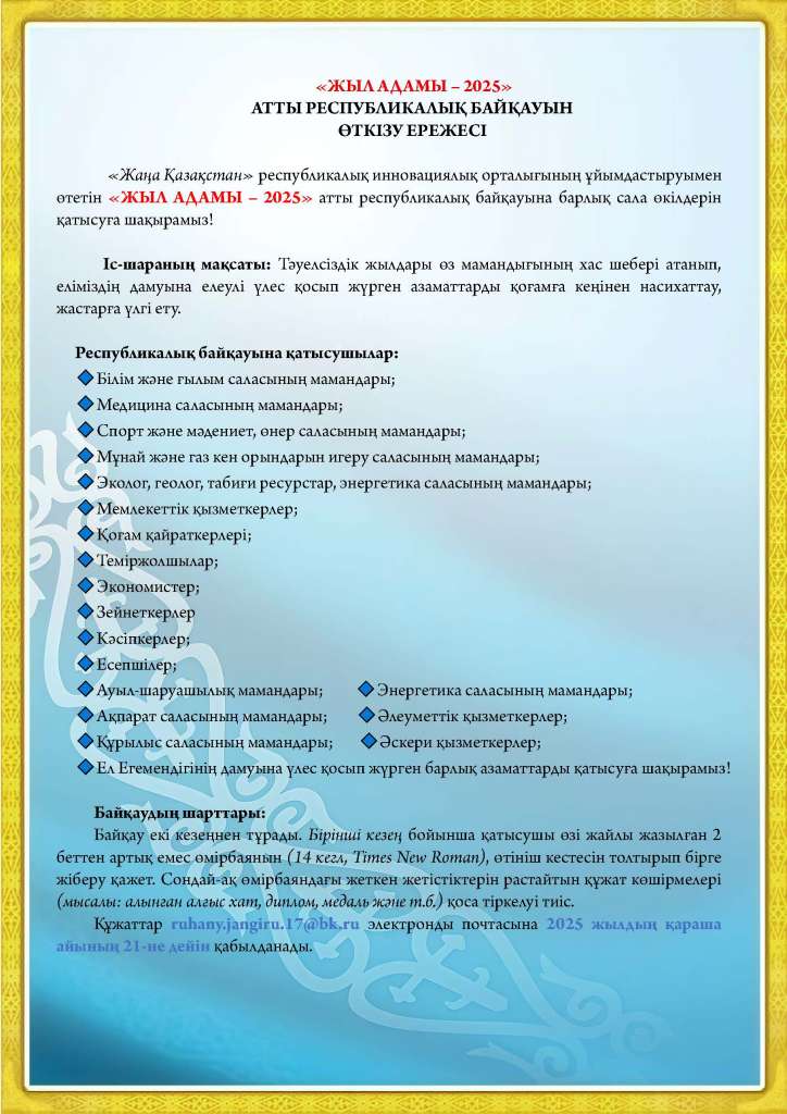 «ЖЫЛ АДАМЫ — 2025» РЕСПУБЛИКАЛЫҚ БАЙҚАУЫ