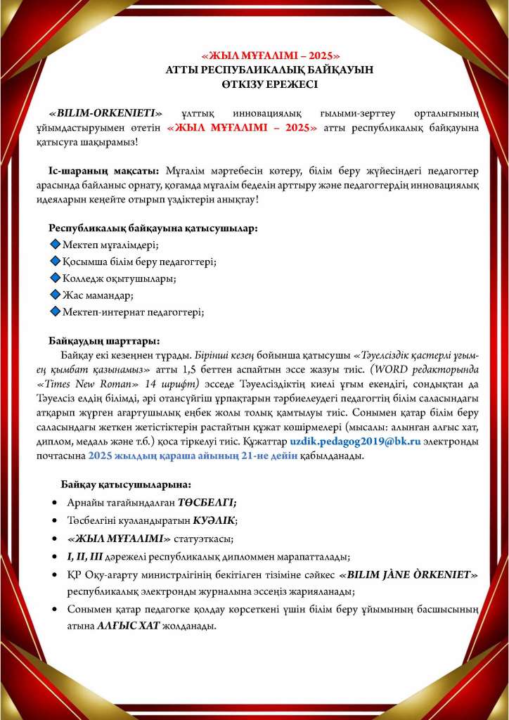 «ЖЫЛ МҰҒАЛІМІ — 2025» РЕСПУБЛИКАЛЫҚ БАЙҚАУЫ
