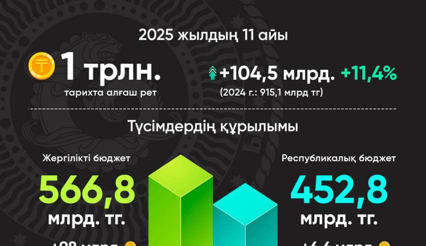 Жергілікті бюджетке түсімдердің айтарлықтай артқаны байқалады: өңірдің меншікті кірістері 566,8 млрд теңгені құрап, 2024 жылғы деңгейден 98 млрд теңгеге немесе 20,9%-ға көп болды (468,9 млрд теңге).