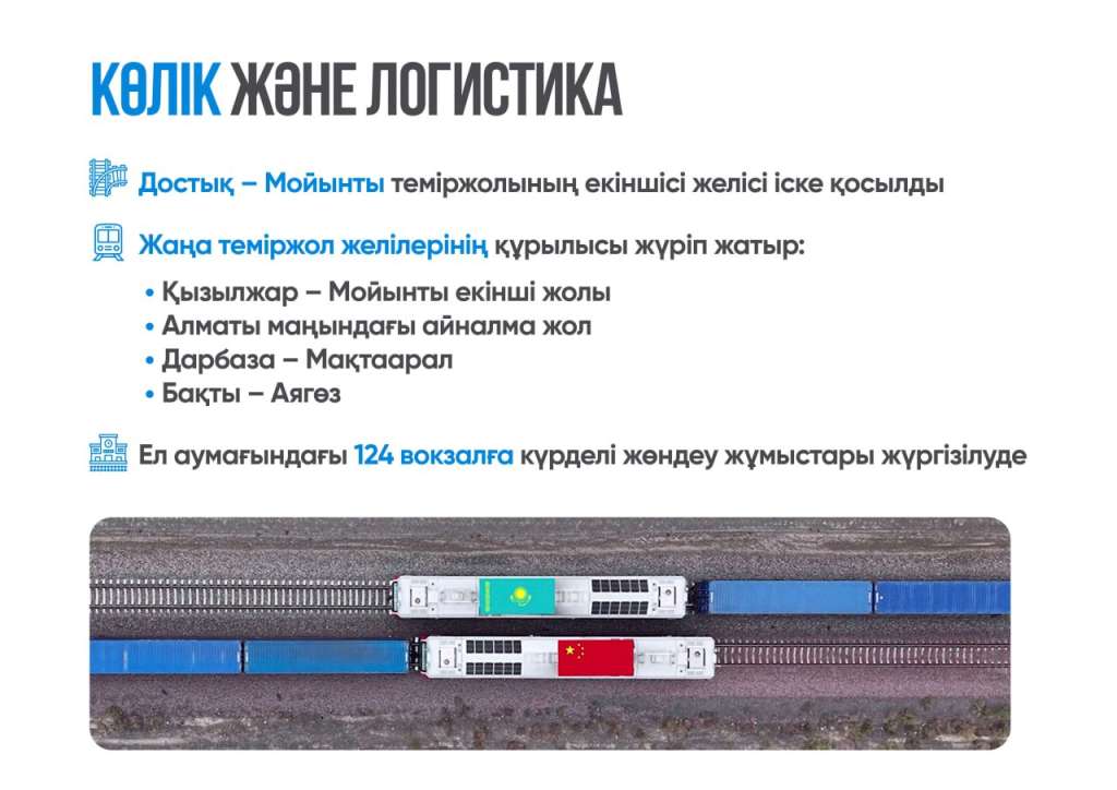 ✔️Қызылжар – Мойынты екінші жолының, Алматы маңындағы айналма жолдың, Дарбаза – Мақтаарал және Бақты – Аягөз жаңа теміржол желілерінің құрылысы жүріп жатыр.