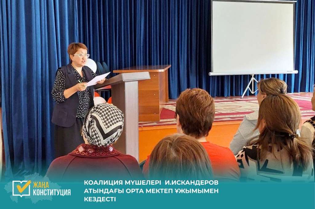 «Әділетті және Прогрессивті Қазақстанның Халықтық Конституциясы үшін!» коалициясының мүшелері Ават ауылындағы И.Искандеров атындағы орта мектеп педагогикалық ұжымымен кездесіп, жаңа Конституция жобасының саяси реформаларын таныстырды.